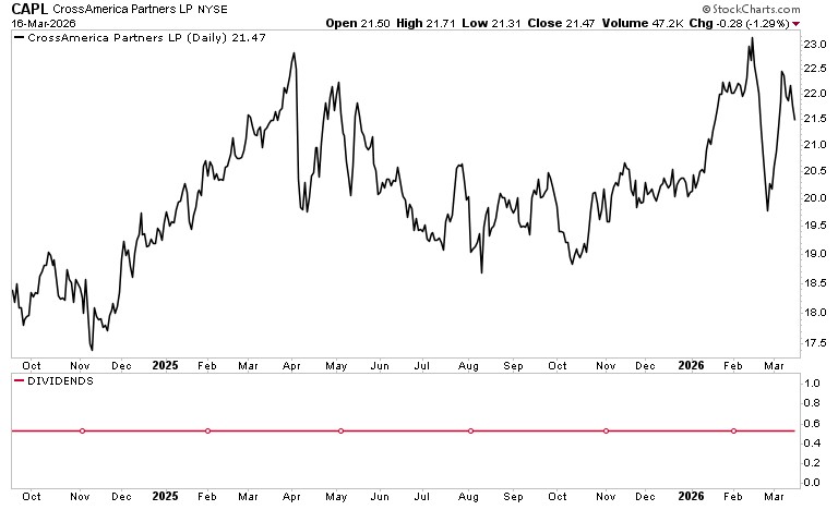 While CAPL drifted lower from those levels for much of the rest of 2025, they popped in the opening months of 2026, hitting a 52-week high of $23.40 in mid-February. It see-sawed in late February and early March on, no doubt, concerns about the war in Iran. But CAPL units have rebounded to a large extent since then, and were trading hands at $21.42 as of March 16. This puts CAPL up 6.7% year to date. For comparison’s sake, the S&P 500 is down 2.2% in 2026.