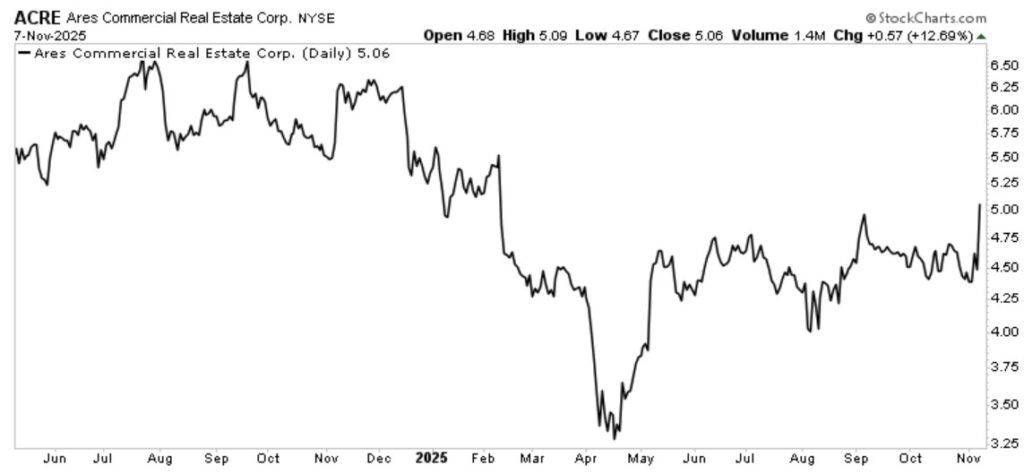 All of this is great news for income hogs and the 181 institutional holders accounting for 46.4% of outstanding shares. The top three are BlackRock Inc., The Vanguard Group Inc, and Geode Capital Management LLC. (Source: “Ares Commercial Real Estate Corporation (ACRE),” Yahoo! Finance, last accessed November 7, 2025.)