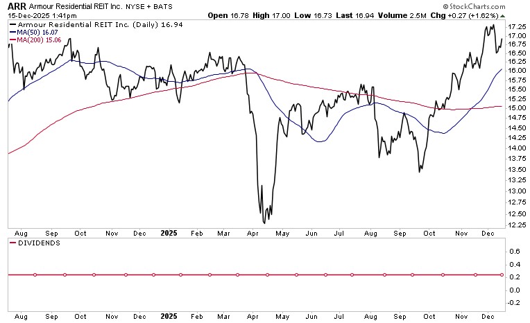 And that’s where ARMOUR Residential REIT, Inc. (NYSE:ARR) comes in. The Vero-Beach-Florida-based company invests primarily in RMBS issued or guaranteed by a U.S.-government-sponsored entity, including the Federal National Mortgage Association (Fannie Mae) and the Federal Home Loan Mortgage Corporation (Freddie Mac), or guaranteed by the Government National Mortgage Administration (Ginnie Mae). (Source: “Corporate Profile,” ARMOUR Residential REIT, Inc., last accessed December 15, 2025.)