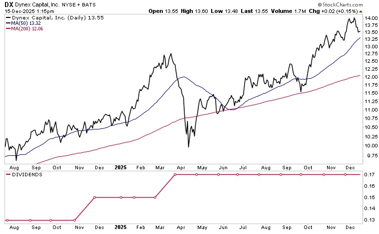 In November 2024, Dynex increased its monthly distribution from $0.13 per share to $0.15 per share. For March 2025, the mREIT’s board increased the monthly distribution again to $0.17 per share. It has held it there since then. This works out to an annual distribution of $2.04 per share, for a massive dividend yield of 15.1%. (Source: “Dynex Capital, Inc. Declares Monthly Common Stock Dividend of $0.17 Per Common Share for November 2025,” Dynex Capital Inc, November 10, 2025.)