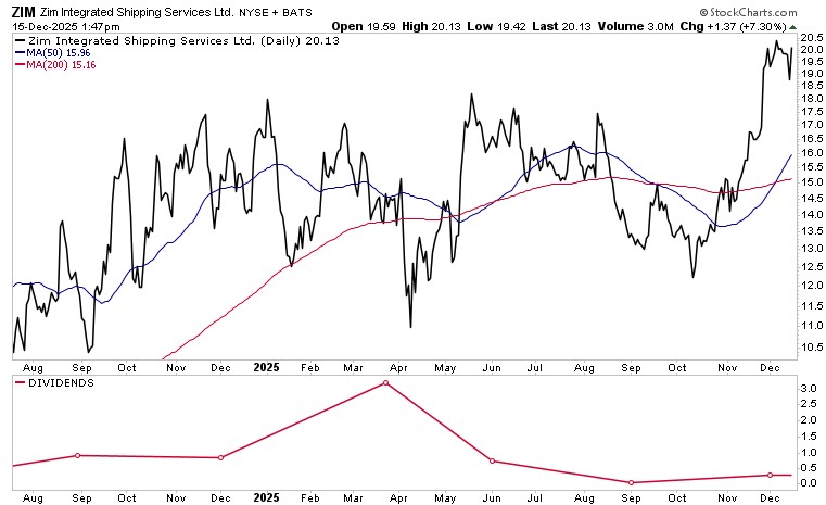 Right now, things are ship-shape for ZIM, with 2025 having been a good year for the company. It just reported solid third-quarter results and increased the midpoint of its 2025 guidance. ZIM stock has also done well of late, trading up: