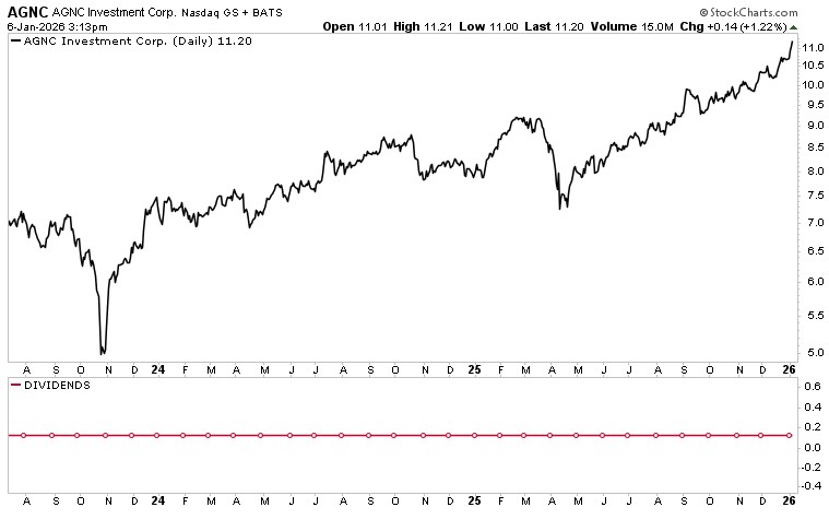 AGNC stock continues to perform well over the short term as well. On January 5, the stock hit a new record high of $11.22. That puts it up:
