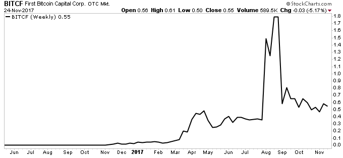 In 2014, management changed the company’s name to First Bitcoin Capital Trust (OTCMKTS:BITCF). It now claims to be the “first vertically integrated, publicly-traded Bitcoin entity.” What that means exactly, who knows? (Source: “1st Bitcoin Capital,” First Bitcoin Capital Trust, last accessed November 27, 2017.)