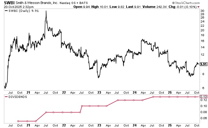 Those tailwinds should persist, with a strong pipeline of new products. That should be good news for both retail investors and the 237 institutional investors that hold 53.8% of all outstanding SWBI shares. Those institutions not scared off of sin stocks include BlackRock Inc, Dimensional Fund Advisors LP, Vanguard Group Inc, and Goldman Sachs Group Inc. (Source: “Smith & Wesson Brands, Inc. (SWBI),” Yahoo! Finance, last accessed October 21, 2025.)