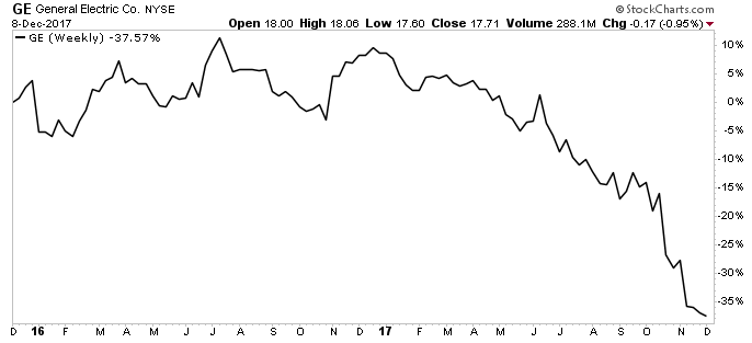 That situation came to ahead in GE’s quarterly dividend announcement Friday, where management slashed the payout to shareholders by 50%. General Electric’s dividend payment day has been scheduled for January 25, 2018. The distribution will be sent to shareholders of record at the close of business on December 27, 2017, bringing General Electric’s ex-dividend date to December 26, 2017. (Source: “GE Board of Directors Authorizes Regular Quarterly Dividend,” General Electric Company, December 8, 2017.)