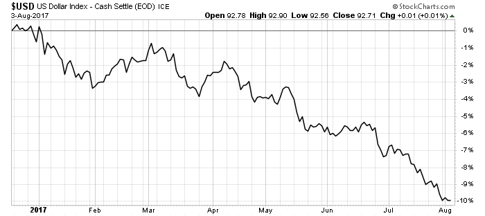 “I like a dollar that’s not too strong,” explained Trump in a recent interview with the Wall Street Journal. “I mean, I’ve seen strong dollars. And frankly, other than the fact that it sounds good, lots of bad things happen with a strong dollar.” (Source: “Full transcript: Trump’s Wall Street Journal interview,” Politico, August 1, 2017.)