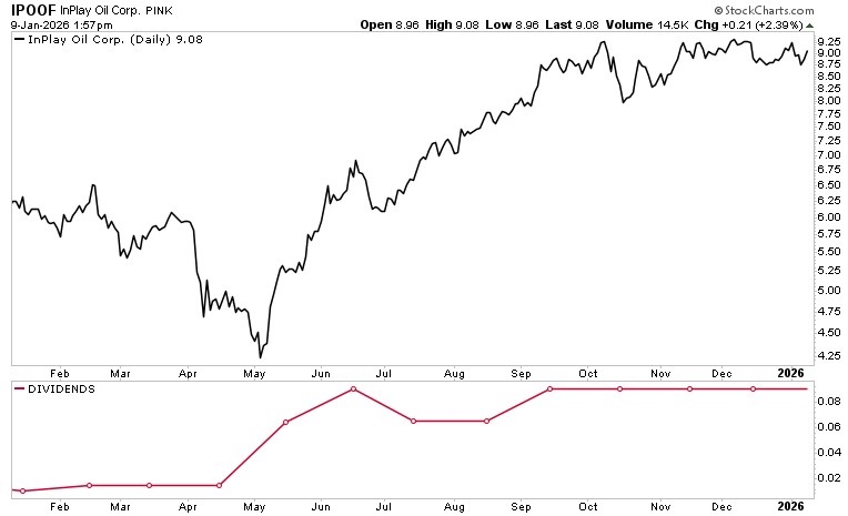 On January 15, the company paid out a monthly dividend of $0.09 per share, or $1.08 per share on an annual basis, for a forward dividend yield of nine percent. (Source: “InPlay Oil Corp. Confirms Monthly Dividend for January 2026,” InPlay Oil Corp, January 2, 2026.)