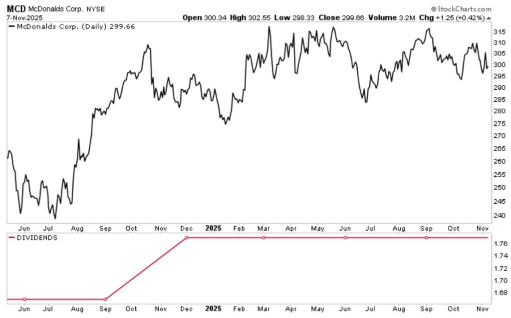 On November 5, the world’s largest restaurant chain reported third-quarter results for the period ended September 30, 2025. Total revenue increased three percent to $7.0 billion, with same-store sales growing 3.6%. (Source: “McDonald’s Reports Third Quarter 2025 Results,” McDonald’s Corp, November 5, 2025.)