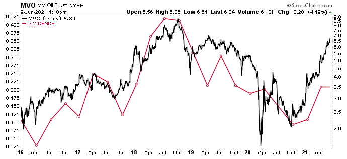 As a result, WV Oil Trust was able to raise its first-quarter dividend by 91% to $0.21 from $0.11 in the fourth quarter of 2020. The current payout is $0.84 per year, which, at the current price of MVO stock, translates to a dividend yield of 12.8%. (Source: “MV Oil Trust Announces Trust First Quarter Distribution,” MV Oil Trust, April 5, 2021.)