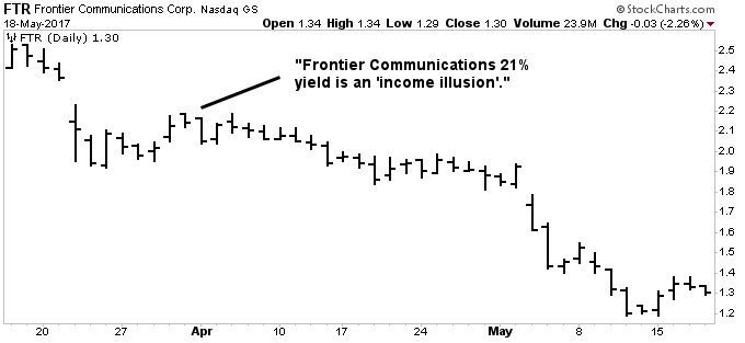 Needless to say, this dividend time bomb finally went off. Last month, executives slashed the quarterly distribution by two-thirds to $0.04 per share. Worse, owners hoping for a big payout now sit on big losses. (Source: “Frontier Communications Corporation Declares Second-Quarter Dividends,” Frontier Communications Corp, May 2, 2017.)