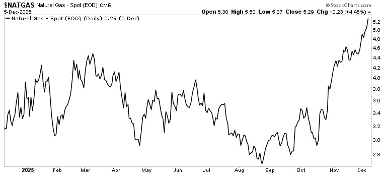 Right now, U.S. natural gas futures are above $5.00 per million British thermal units (MMBtu), their highest level since 2002. Natural gas prices are being energized by the cold winter weather and strong exports. In fact, prices are up by more than 70% since October.
