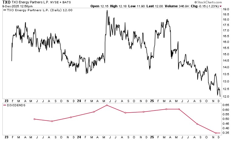 Most recently, in November, it paid out a third-quarter distribution of $0.35 per unit, or $2.02 per unit on an annual basis, for a forward dividend yield of 16.2%. (Source: “TXO Partners Declares a Third Quarter 2025 Distribution of $0.35 on Common Units; Files Quarterly Report on Form 10-Q,” TXO Partners LP, November 4, 2025.)