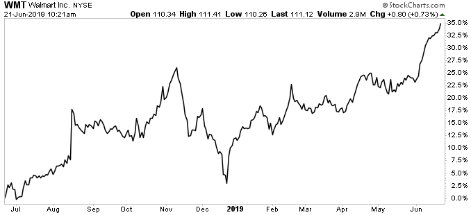 However, Walmart Inc now appears poised for a resurgence. The company has posted blowout comps in its most recent financial reports, including same-store sales being up 4.2% in the fiscal fourth quarter and 3.4% in the first. Management has credited the increase to the company’s booming grocery sales. And Walmart, like rivals, has also seen a big boost in toy sales, which have benefited from the bankruptcy of former category giant Toys R Us Inc. (Source: “Walmart U.S. Q1 comp sales grew 3.4% and Walmart U.S. eCommerce sales grew 37%,” Walmart Inc, May 16, 2019.)