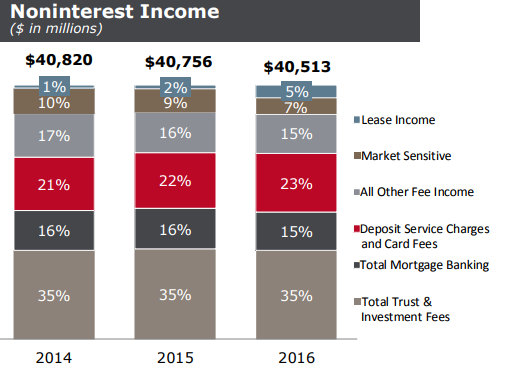 Wells Fargo’s noninterest income includes deposit service charges, card fees, trust and investment fees, mortgage banking fees, market sensitive fees, and other fee income.